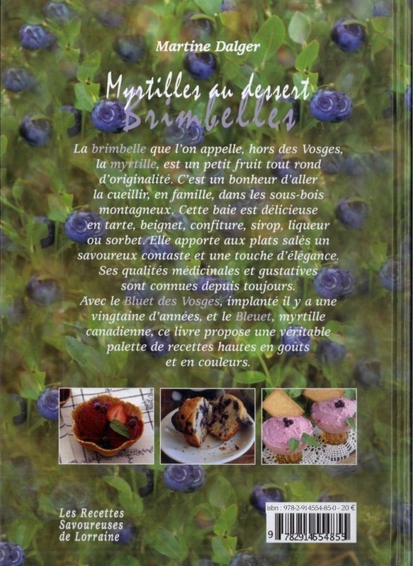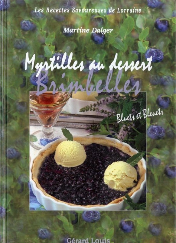Myrtilles au dessert. La brimbelle que l’on appelle, hors des Vosges, la myrtille, est un petit fruit tout rond d’originalité. C’est un bonheur d’aller la cueillir, en famille, dans les sous-bois montagneux. Elle apporte aux plats salés un savoureux contraste et une touche d’élégance. Ses qualités médicinales et gustatives sont connues depuis toujours. Avec le Bluet dans Vosges, implanté il y a une vingtaine d’années, et le Bleuet, myrtille canadienne, ce livre propose une véritable palette de recettes hautes en goûts et en couleurs.