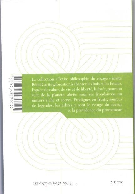 La collection " Petite philosophie du voyage " invite Rémi Caritey, forestier, à chanter les bois et les futaies. Espace de calme, de vie et de liberté, la forêt, poumon vert de la planète, abrite sous ses frondaisons un univers riche et secret. Prodigues en fruits, sources de légendes, les arbres y sont le refuge du rêveur et la providence du promeneur.