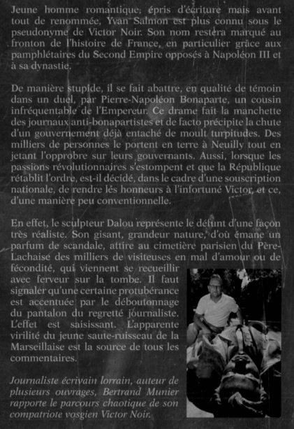 L’auteur, Bertrand Munier, journaliste écrivain, rapporte le parcours chaotique et dramatique de son compatriote vosgien. Il nous dit que Victor Noir, jeune homme romantique, épris d’écriture, se nommait Yvan Salmon. Il figurait parmi les opposants au Second Empire. Victor Noir sera révolvérisé, en qualité de témoin dans un duel, par Pierre-Napoléon Bonaparte, un cousin violent et caractériel de l’Empereur, et, père de Marie Bonaparte qui deviendra une psychanalyste célèbre, proche de Sigmund Freud. Le sculpteur, Jules Dalou fit une représentation de Victor Noir en gisant, au cimetière du Père Lachaise qui attire, par ses proéminences des milliers de visiteuses en mal d’amour, ou, de fécondité. Il en résulte des « usures » de la sculpture, révélatrices de frénésies contagieuses et spectaculaires. Avec une préface de David Chanterrane, rédacteur en chef de la revue du souvenir napoléonien, et, attaché de conservation du musée Napoléon de Brienne-le-Château. Une lecture indispensable. Contient un cahier graphique en fin d’ouvrage, et, la liste des principaux protagonistes de l’affaire Noir.