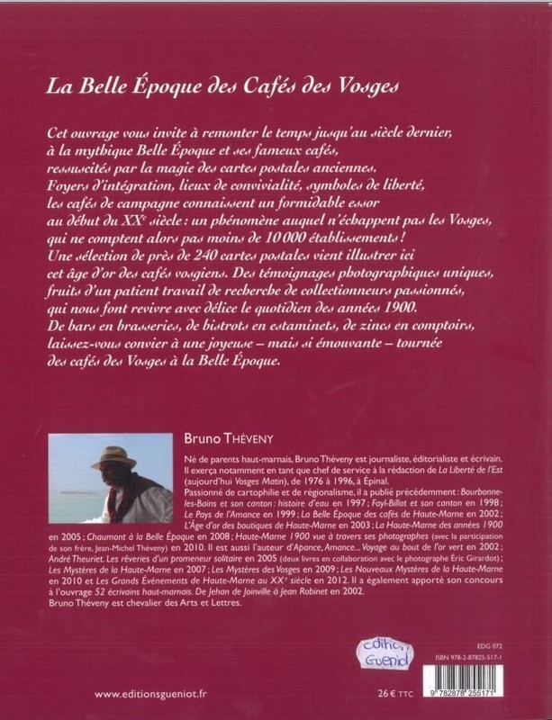 Cet ouvrage vous invite à remonter le temps jusqu au siècle dernier, à la mythique Belle époque et ses fameux cafés, ressuscités par la magie des cartes postales anciennes. Foyers d intégration, lieux de convivialité, symboles de liberté, les cafés de campagne connaissent un formidable essor au début du XXe siècle : un phénomène auquel n'échappent pas les Vosges, qui ne comptent alors pas moins de 10000 établissements ! Une sélection de près de 240 cartes postales vient illustrer ici cet âge d'or des cafés vosgiens. Des témoignages photographiques uniques, fruits d'un patient travail de recherche de collectionneurs passionnés, qui nous font revivre avec délice le quotidien des années 1900. De bars en brasseries, de bistrots en estaminets, de zincs en comptoirs, laissez-vous convier à une joyeuse mais si émouvante tournée des cafés des Vosges à la Belle époque.