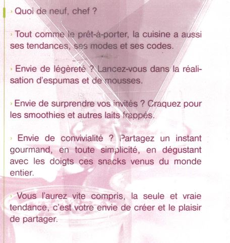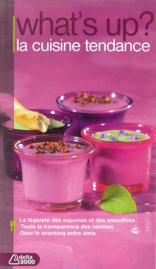 What's up, la cuisine tendance. Quoi de neuf, chef ? Tout comme le prêt-à-porter, la cuisine a aussi ses tendances, ses modes et ses codes. Envie de légèreté ? Lancez-vous dans la réalisation d'espumas et de mousses. Envie de surprendre vos invités ? Craquez pour les smoothies et autres laits frappés. Envie de convivialité ? Partagez un instant gourmand, en toute simplicité, en dégustant avec les doigts ces snacks venus du monde entier. Vous l'aurez vite compris, la seule et vraie tendance, c'est votre envie de créer et le plaisir de partager. La légèreté des espumas et des smoothies. Toute la transparence des verrines. Osez le snacking entre amis. 60 délicieuses recettes à découvrir. 96 pages.
